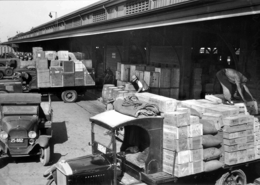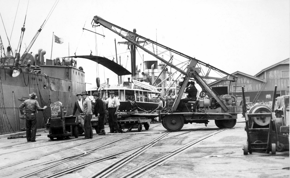 Cargo handling was labour intensive and the waterside workers worked in basic, sometimes dangerous conditions. Gangs of lumpers, as they were known then, would descend into the holds once the ship was moored. Cargo would be winched out in slings and lowered onto the wharf. Others would sort the cargo and wheel it on trolleys into the cargo sheds. With no forklifts, it was purely manual labour. As well as the lumpers, there were other workers, for example tally clerks, watchmen, shipwrights, plumbers, painters, mechanics - even a ratcatcher. Over the years, as mechanisation developed, steam winches were replaced by electric versions and shore-based cranes and conveyors of various types populated the wharves.
